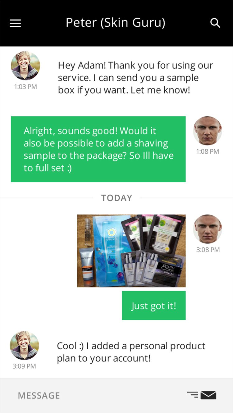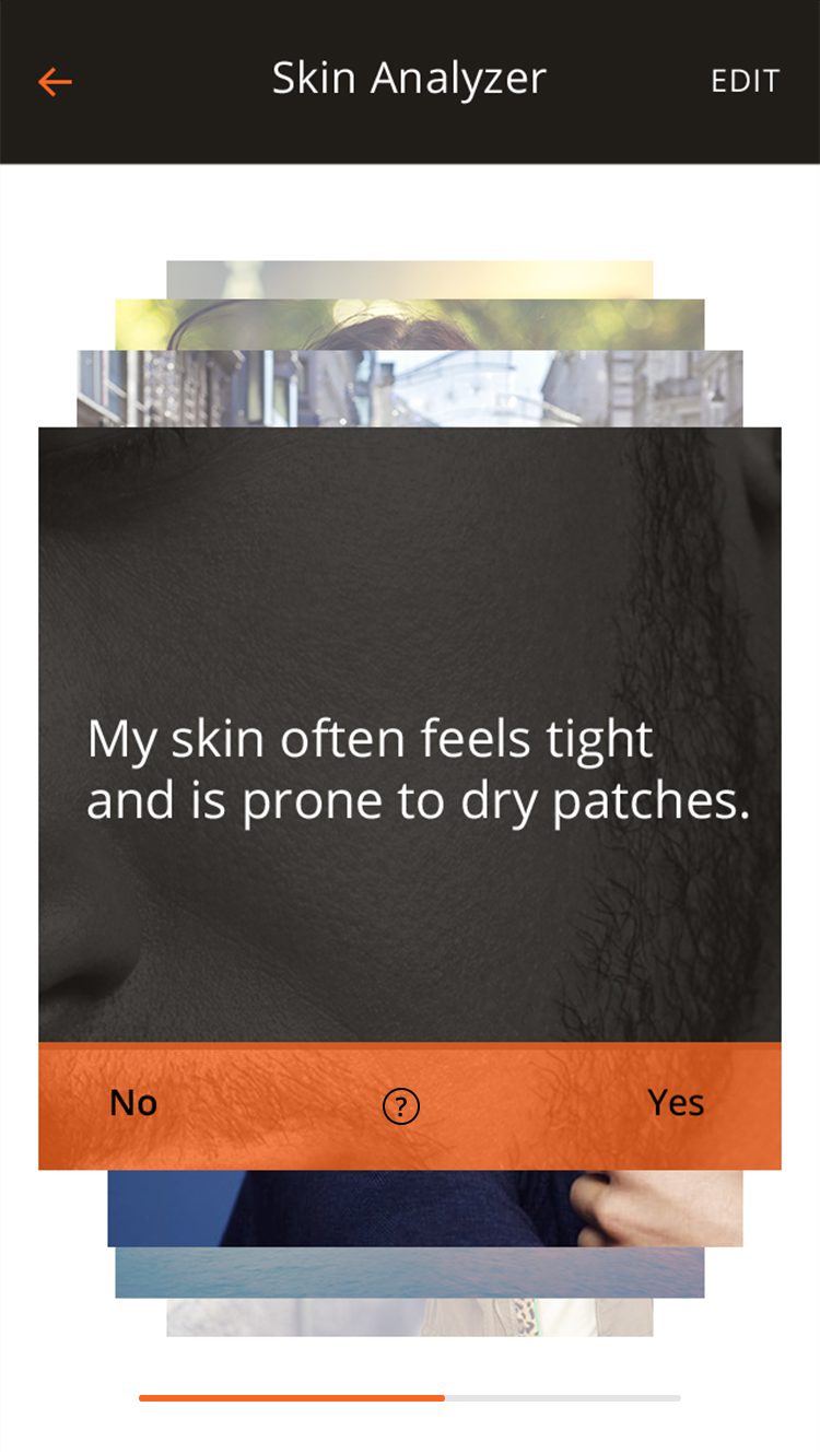 – Skin analyser: with a simple interface, men can identify their skin type and add personal preferences.